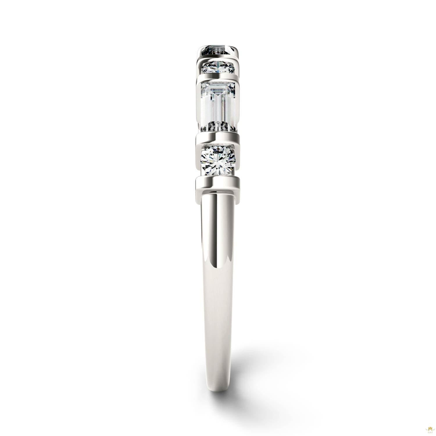 A sleek, beautiful band with a alternating baguette and round cut gemstones in a bar setting. Pair with other rings to create a whole look or wear alone for a bit of added shine.
